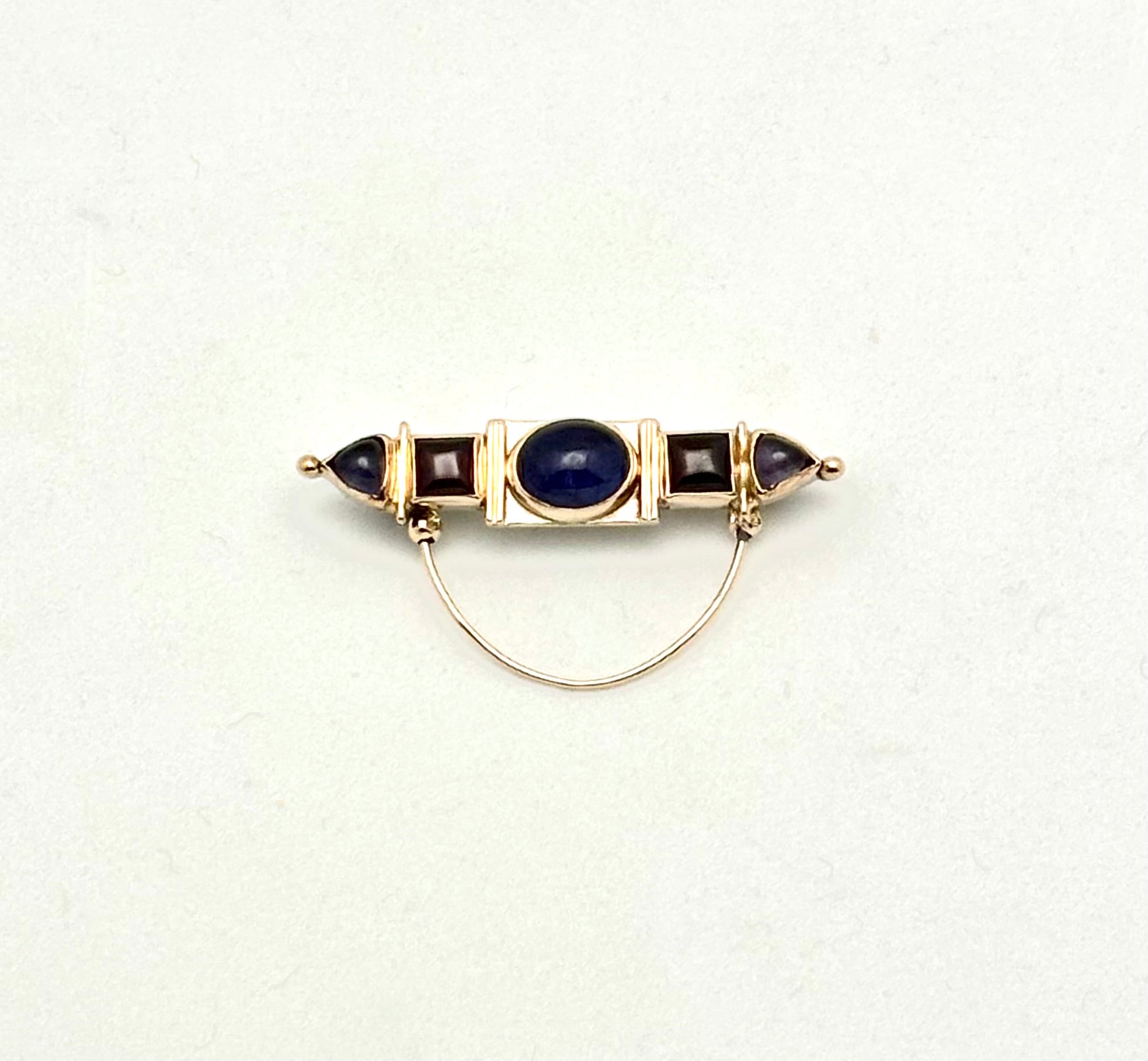 Brooch - 14k yellow gold and sterling silver with centre oval cabochon 10mm x 8mm iolite, 2 square cabochon 6mm garnets and 2 triangle cabochon 5mm iolites, all bezel set in 14k yellow gold, 14k yellow gold wire to hang glasses!