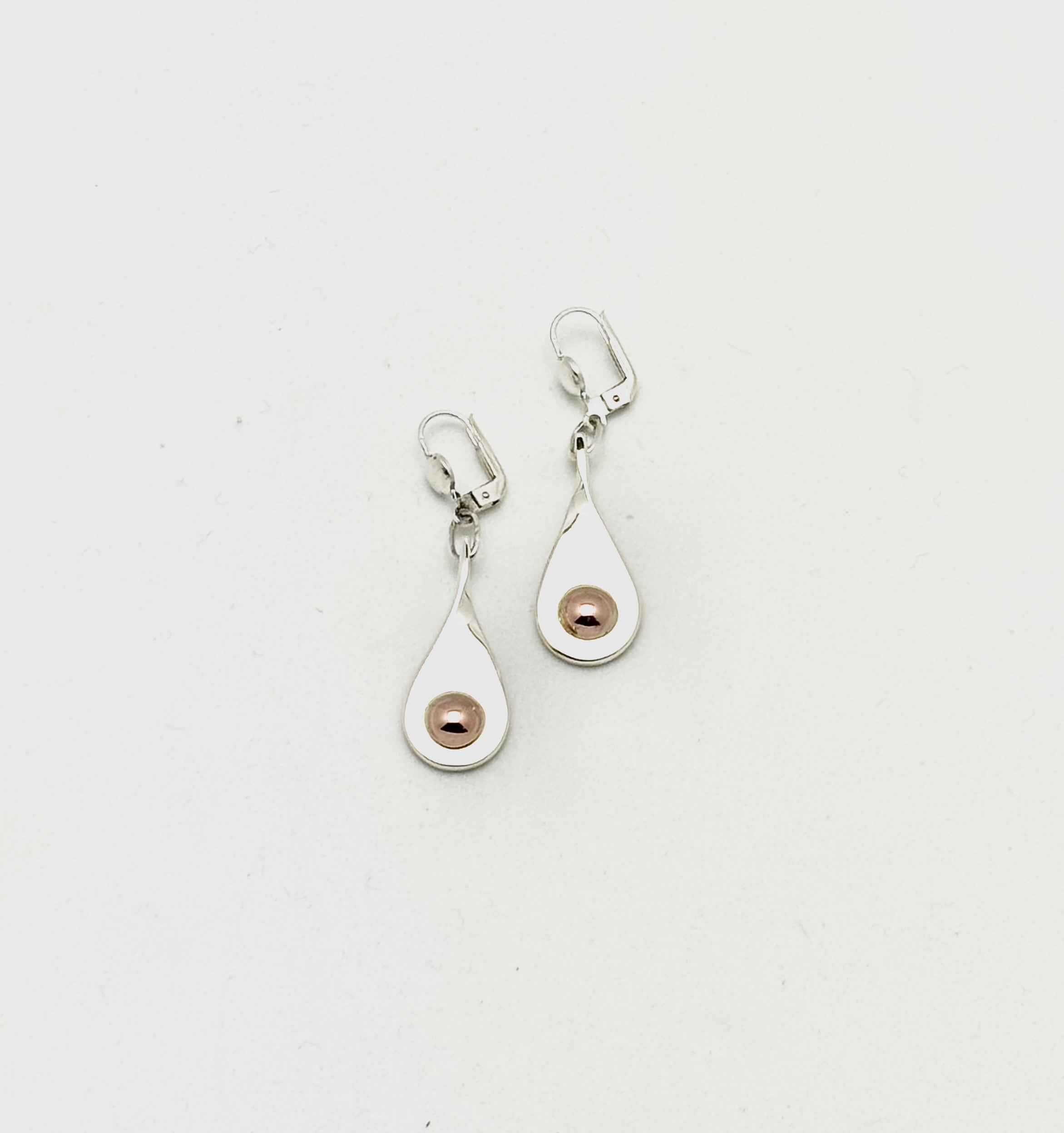 Earrings - sterling silver with 14k red gold dome overlay, forged teardrop design, 28mm long.