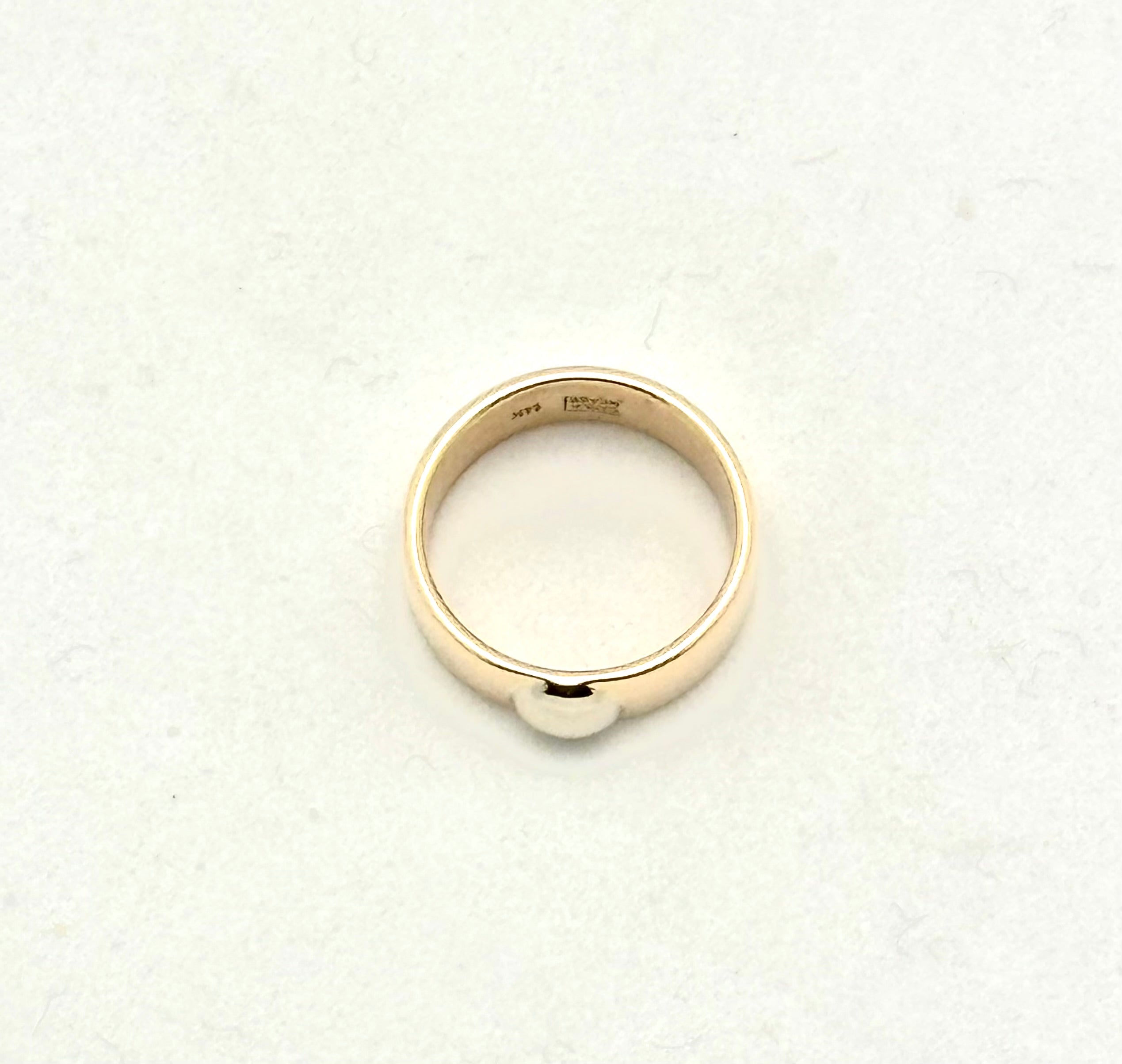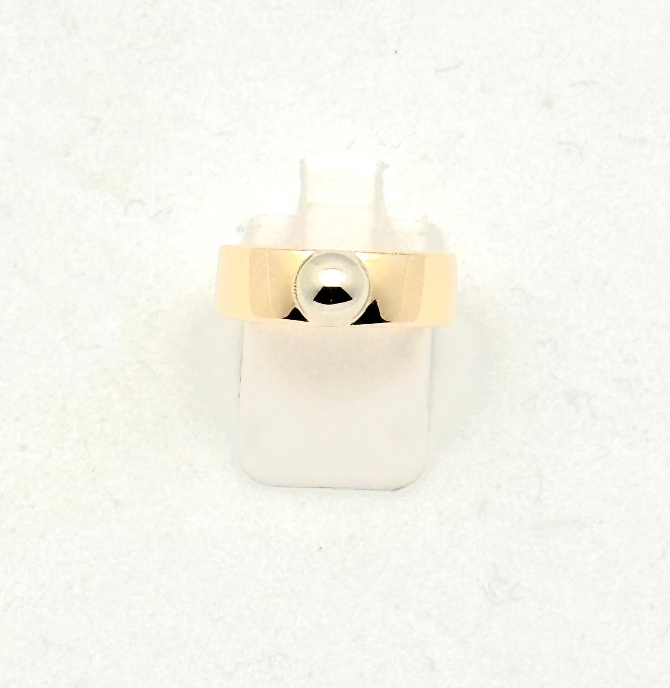 Ring - 14k yellow gold flat shank, 7mm wide, with 14k white gold dome overlay, 7mm in diameter, made in a size 6, weighing 4.9 grams.