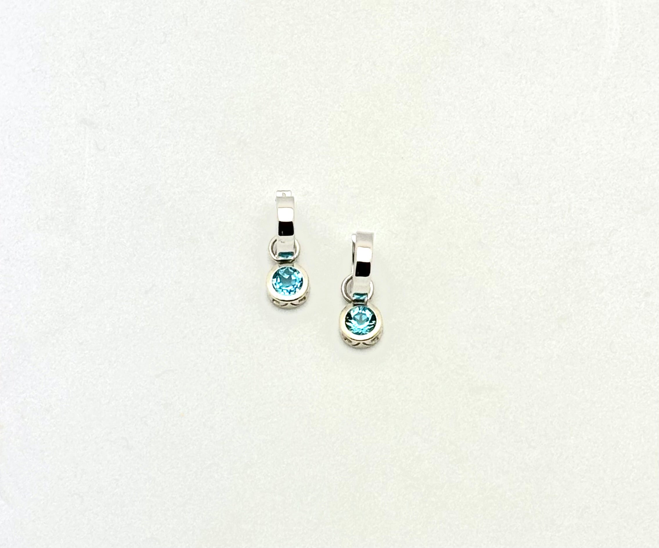 Enhancers and hoops - sterling silver Olivia design bezel set Swiss Blue topaz enhancers ($295) presented on 14k white gold flat hinge hoops, 13mm in diameter ($895)