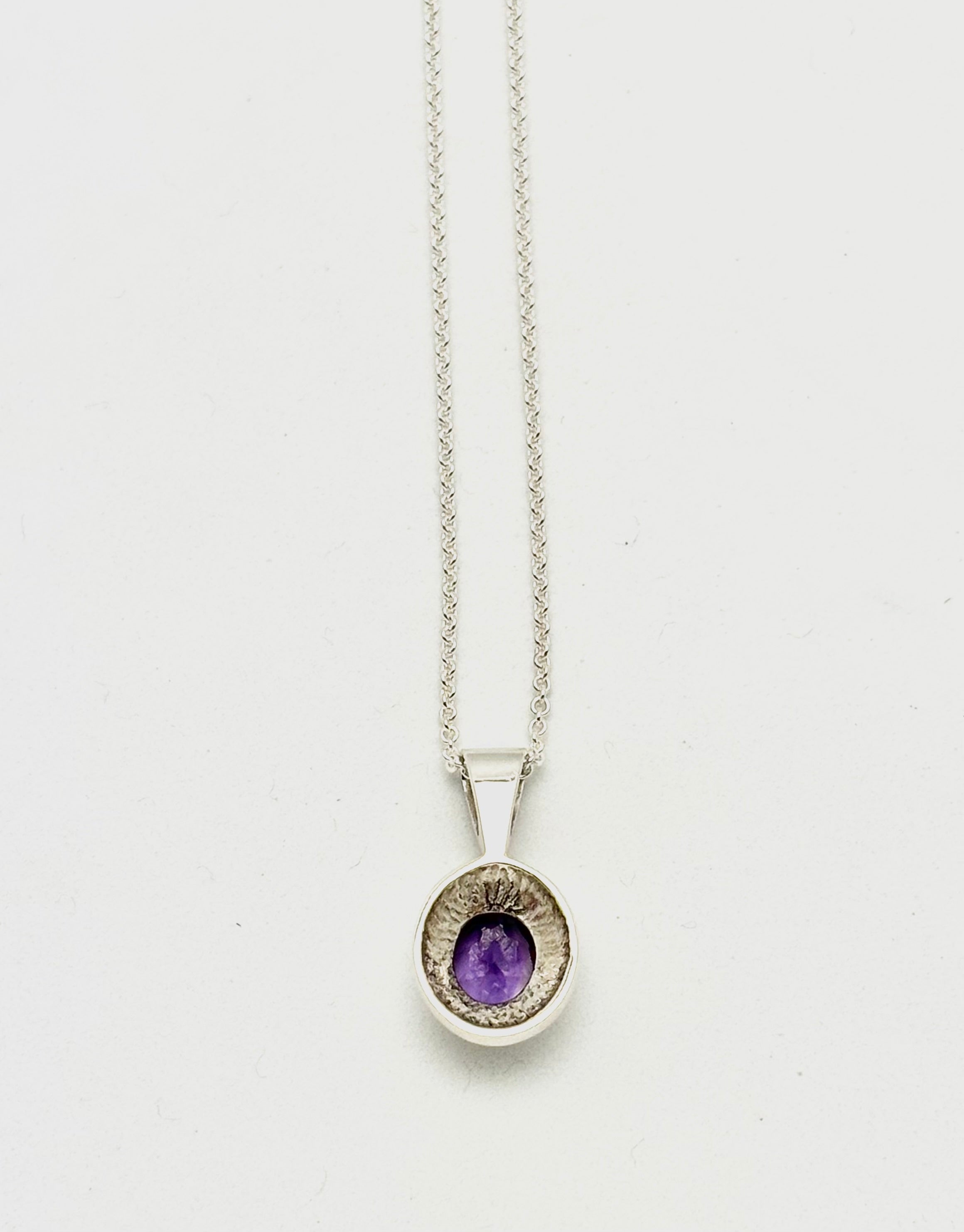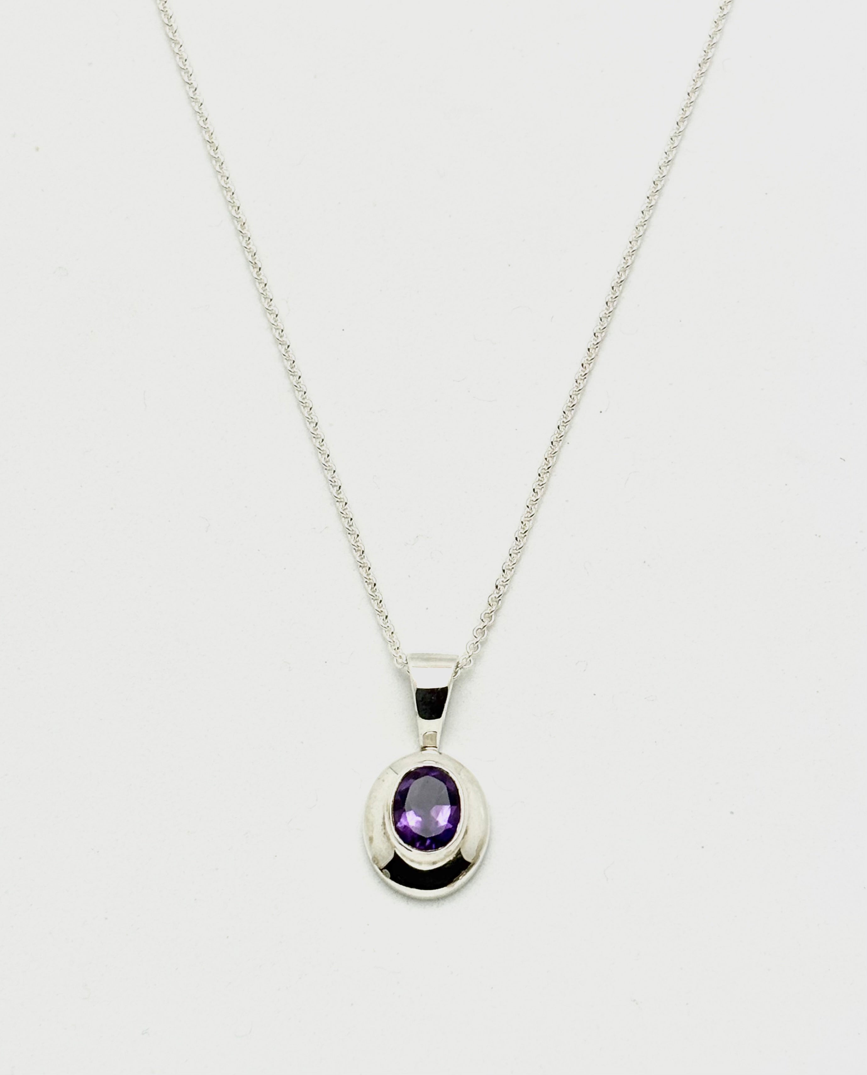 Pendant - sterling silver with faceted, oval, 10mm x 8mm, bezel set Amethyst, wide lip, open back design with triangular sheet bail ($330) offered on sterling silver 18 inch chain ($65)