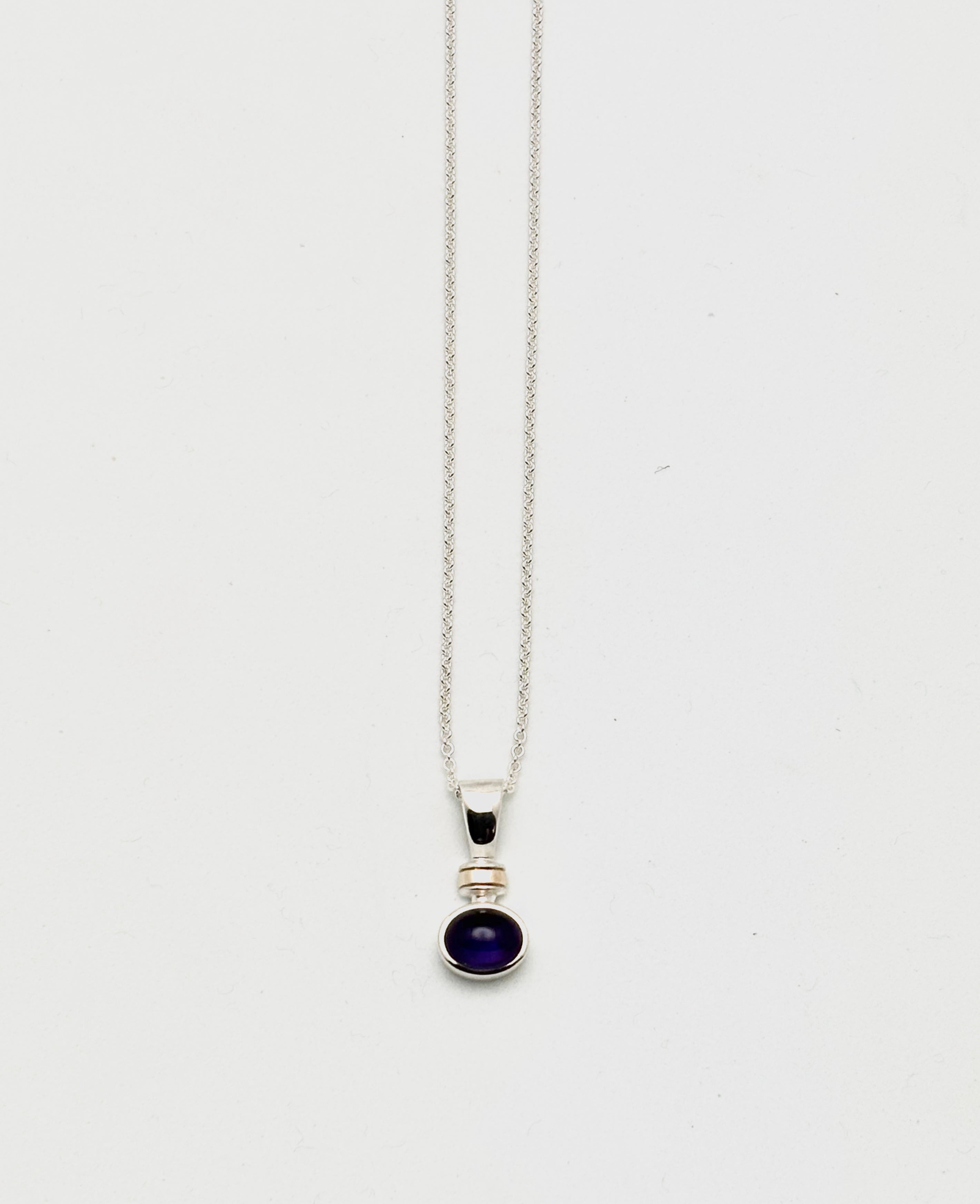 Pendant - sterling silver and 14k gold with oval, bezel set, 10mm x 8mm cabochon Amethyst, gold bar above gem design, triangular sheet bail ($395) offered on sterling silver chain, 16 inches long ($60).