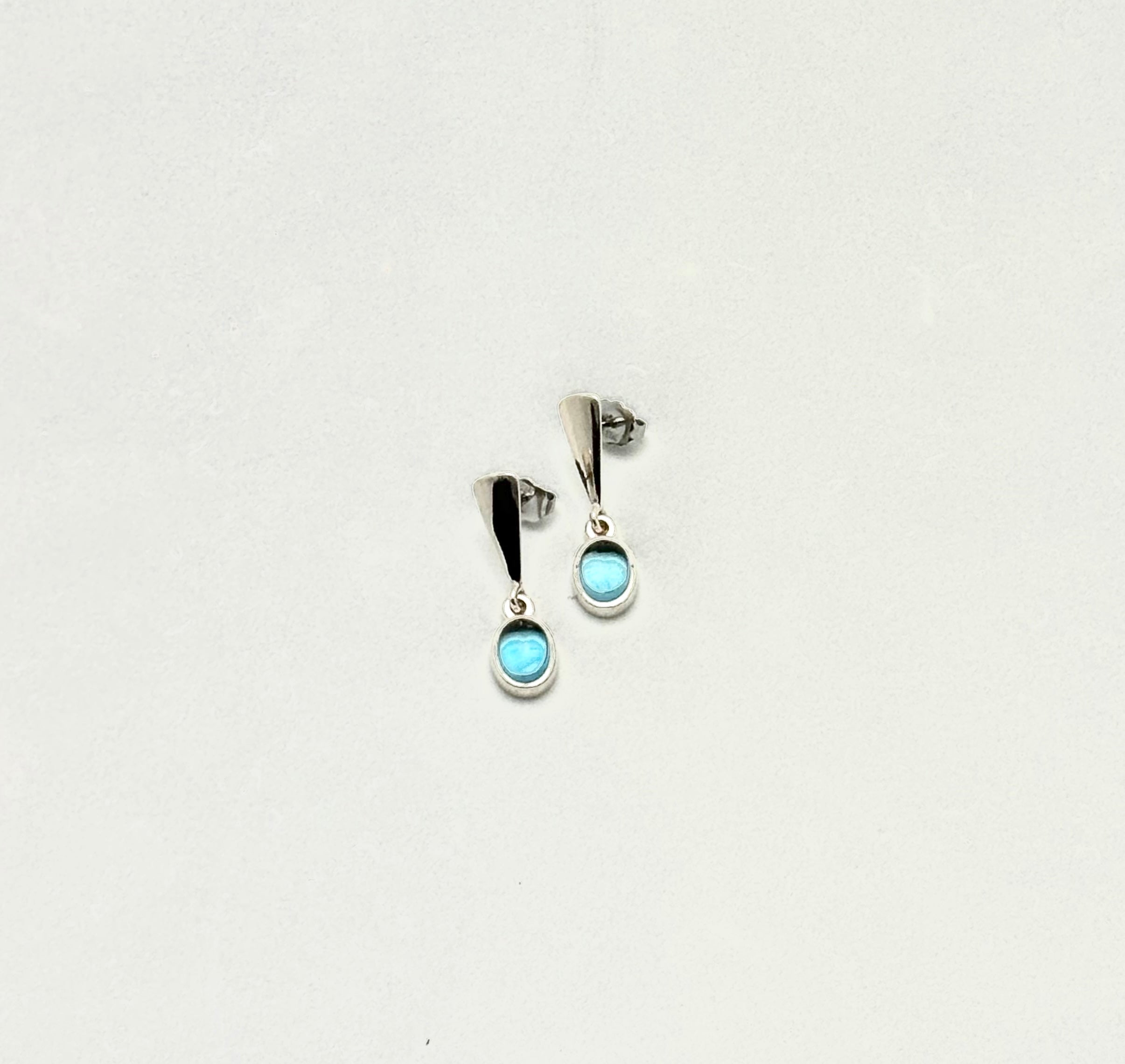 Earrings - sterling silver shield drop style with oval, 8mm x 6mm cabochon Swiss Blue Topaz cabochons, bezel set.