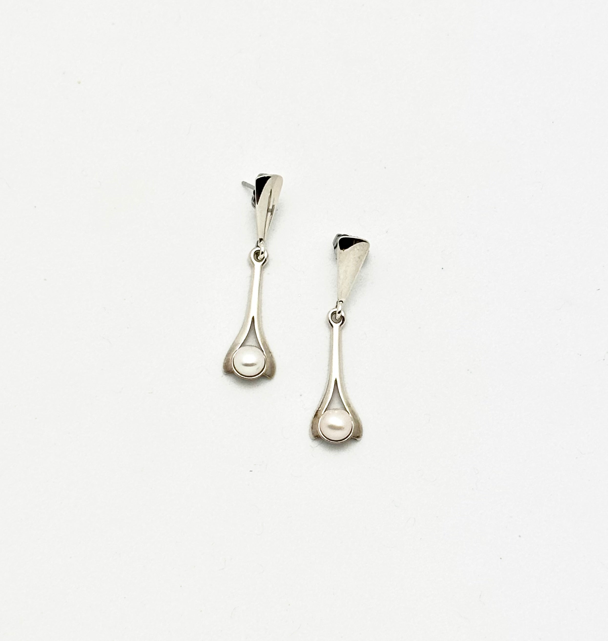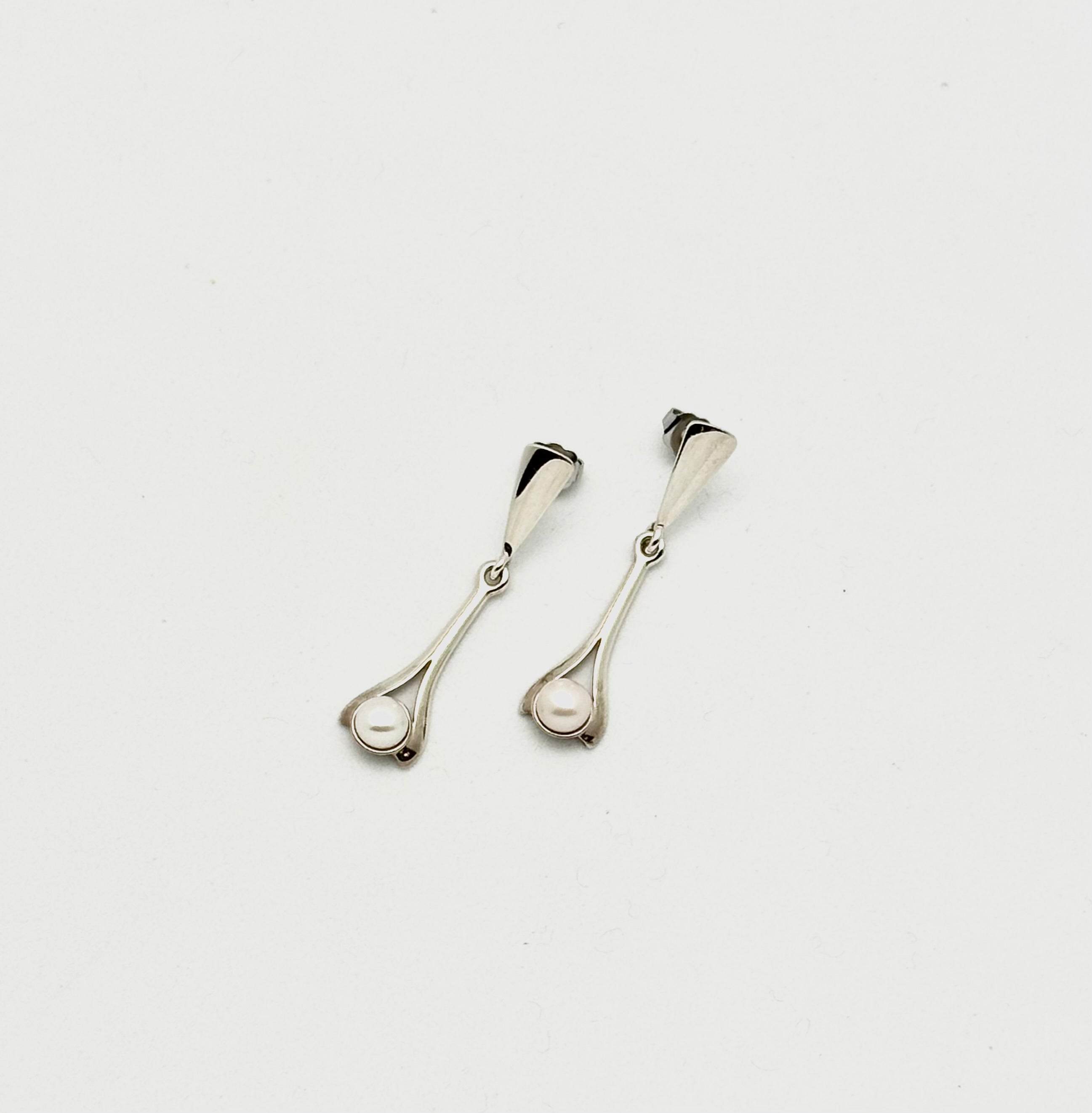 Earrings - sterling silver with 5.5mm white button pearls, stud drop style, drop section measuring 22mm long.