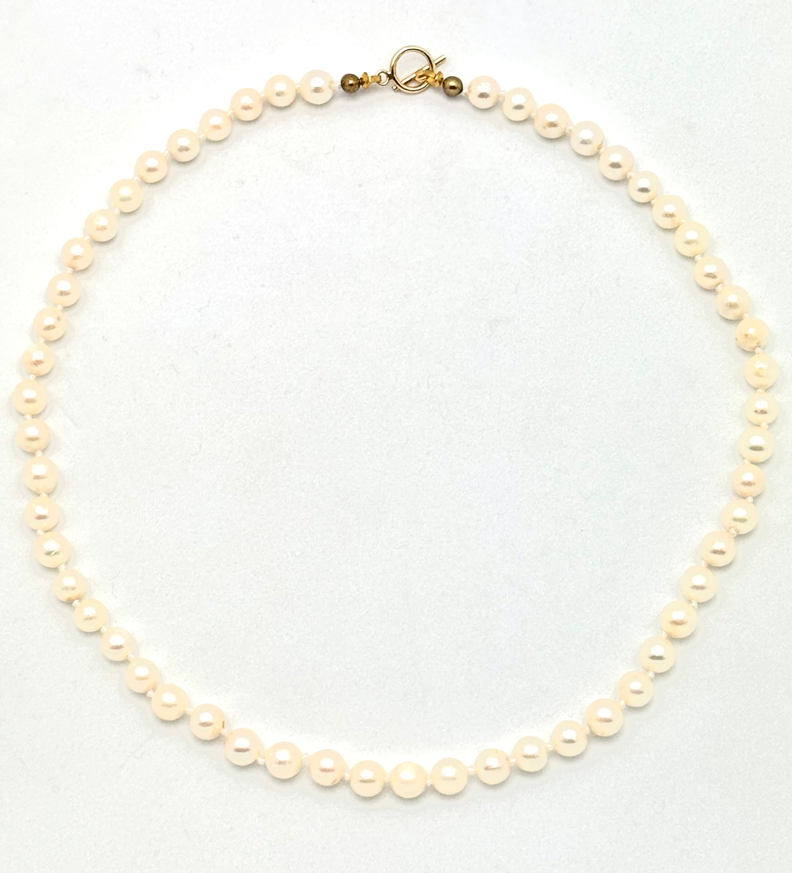 Necklace - Freshwater pearls, 54 - 6mm creamy white fully drilled, strung on silk, knotted between each, appointed by two bronze pearls and a sleek gold filled toggle clasp.