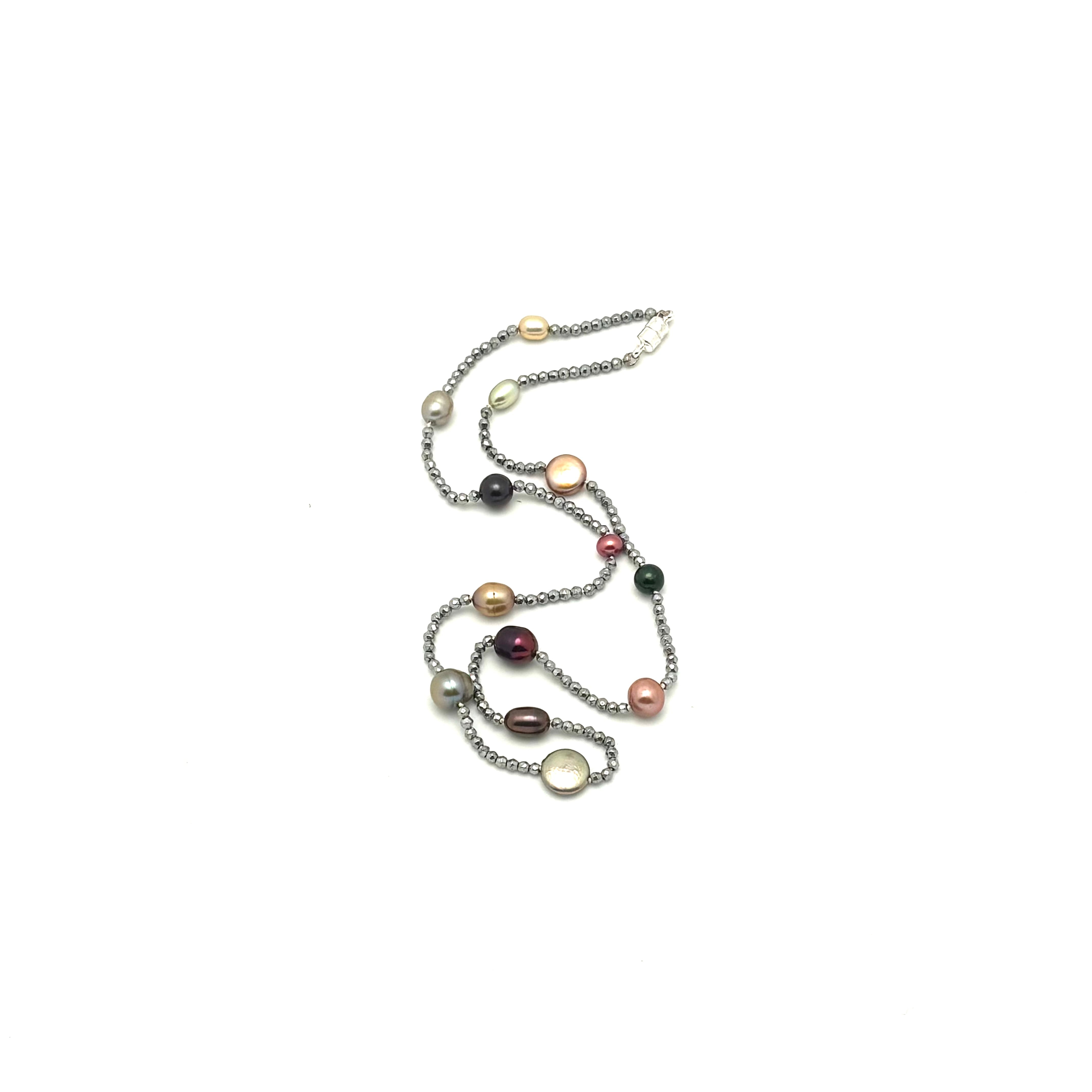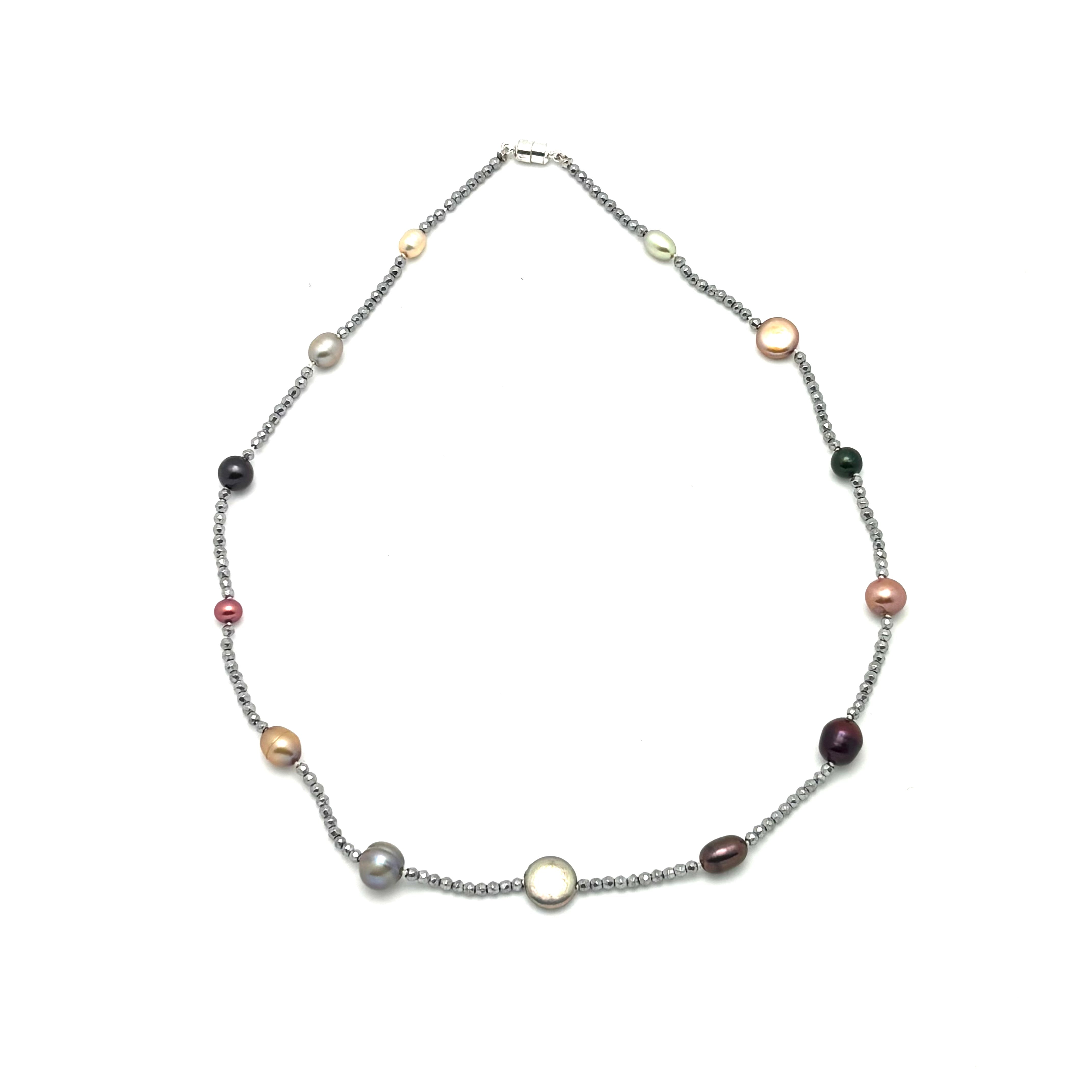 Necklace - Cultured freshwater pearls and hematite in an array of colours, shapes and sizes ranging from 4mm - 7mm, individually knotted on silk and finished with a sterling silver magnetic clasp.