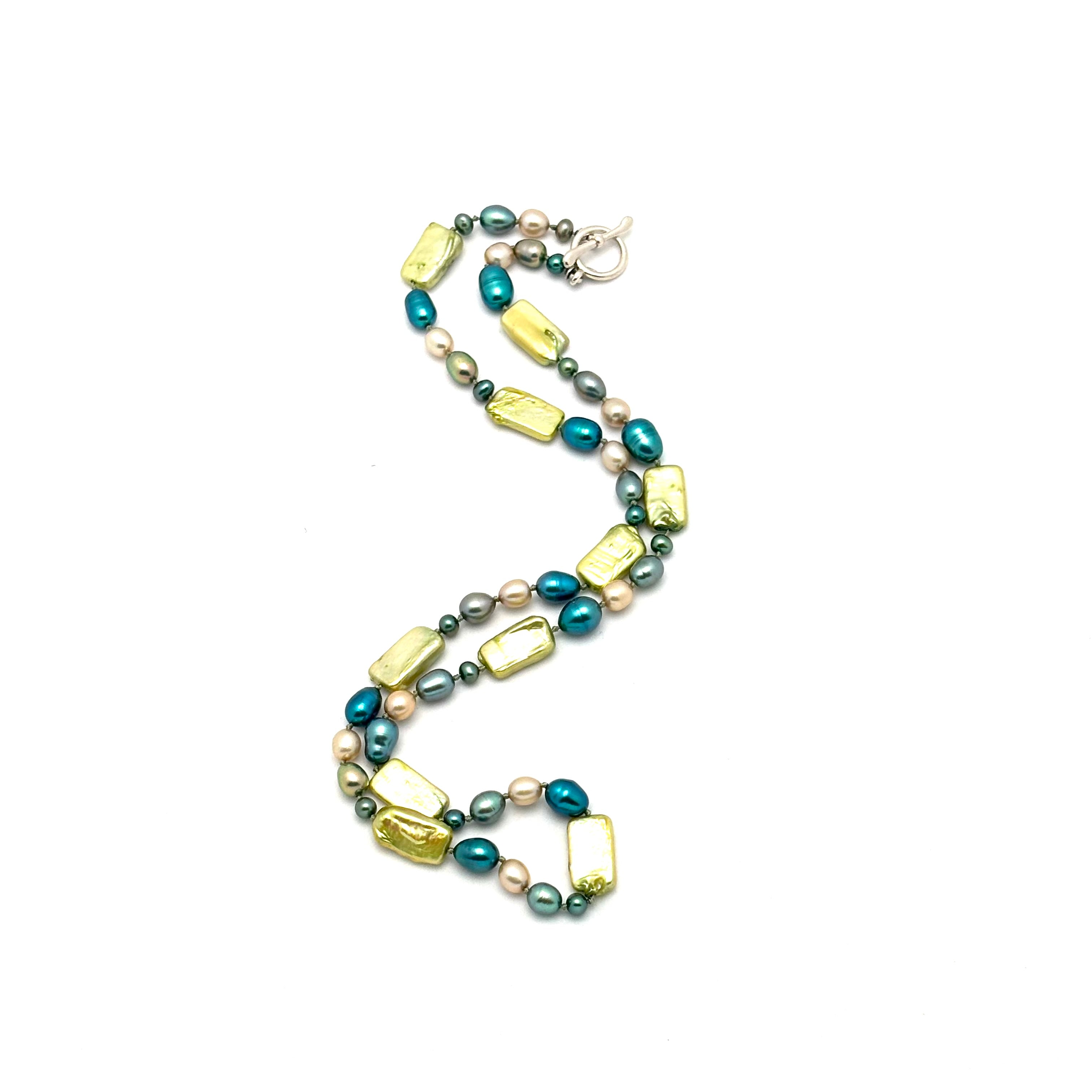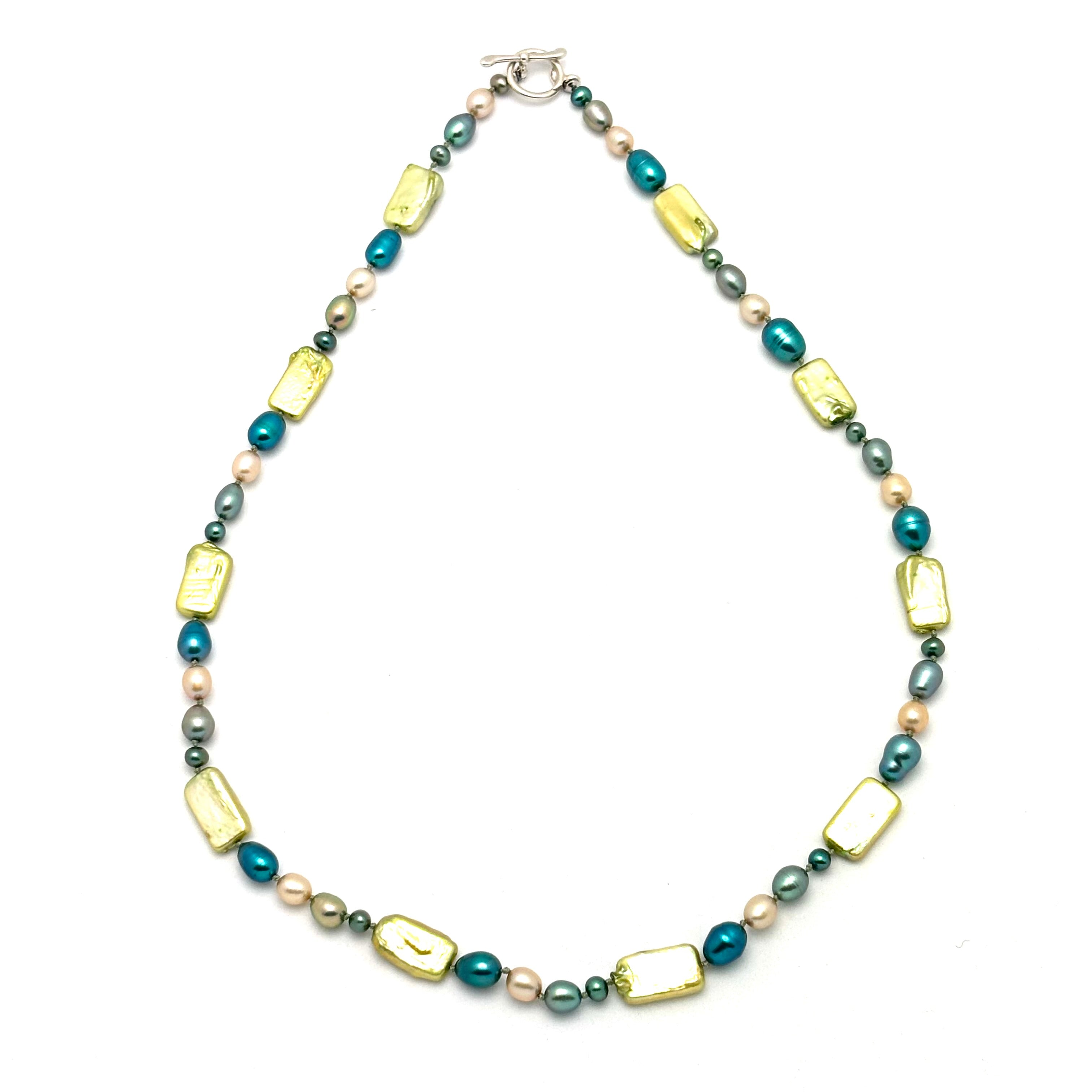 Necklace - Cultured freshwater pearls in an array of colours, shapes and sizes ranging from 4mm - 7mm, individually knotted on silk and finished with a sterling silver toggle clasp.