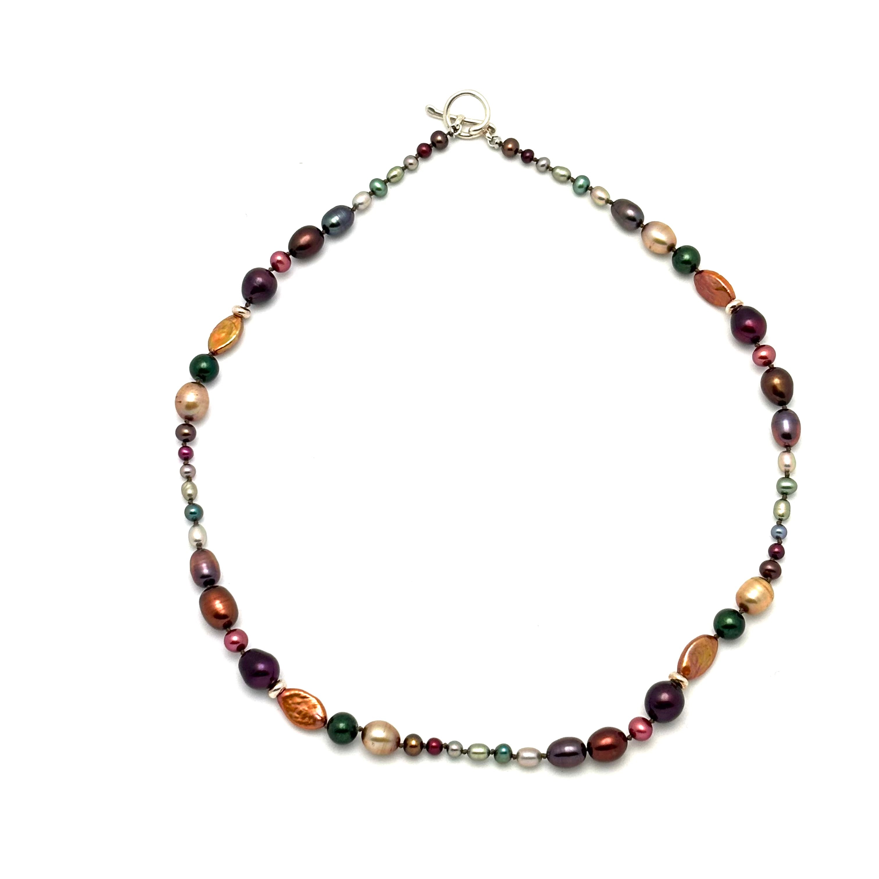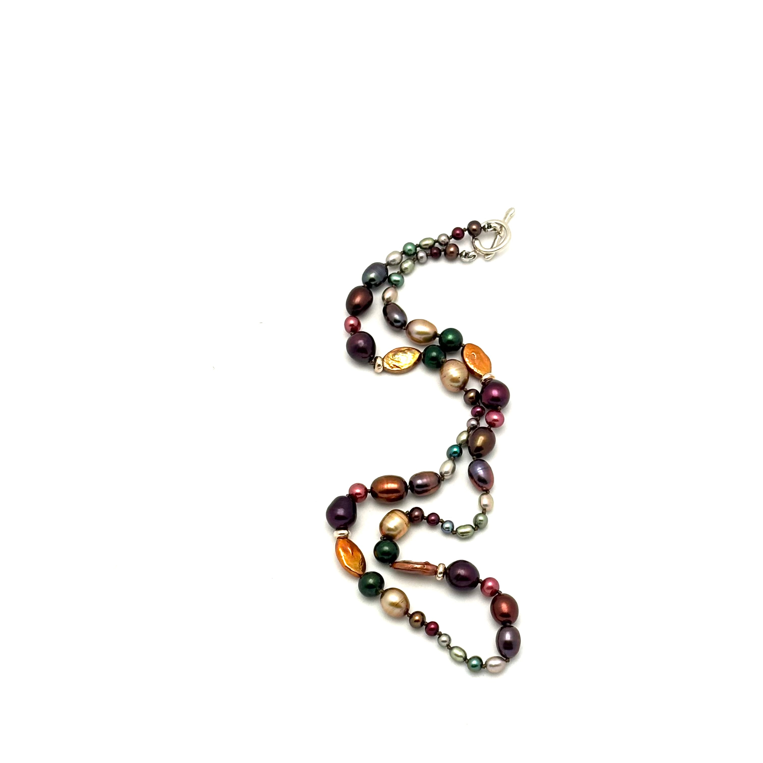 Necklace - Cultured freshwater pearls in an array of colours, shapes and sizes ranging from 4mm - 7mm, individually knotted on silk and finished with a sterling silver toggle clasp.