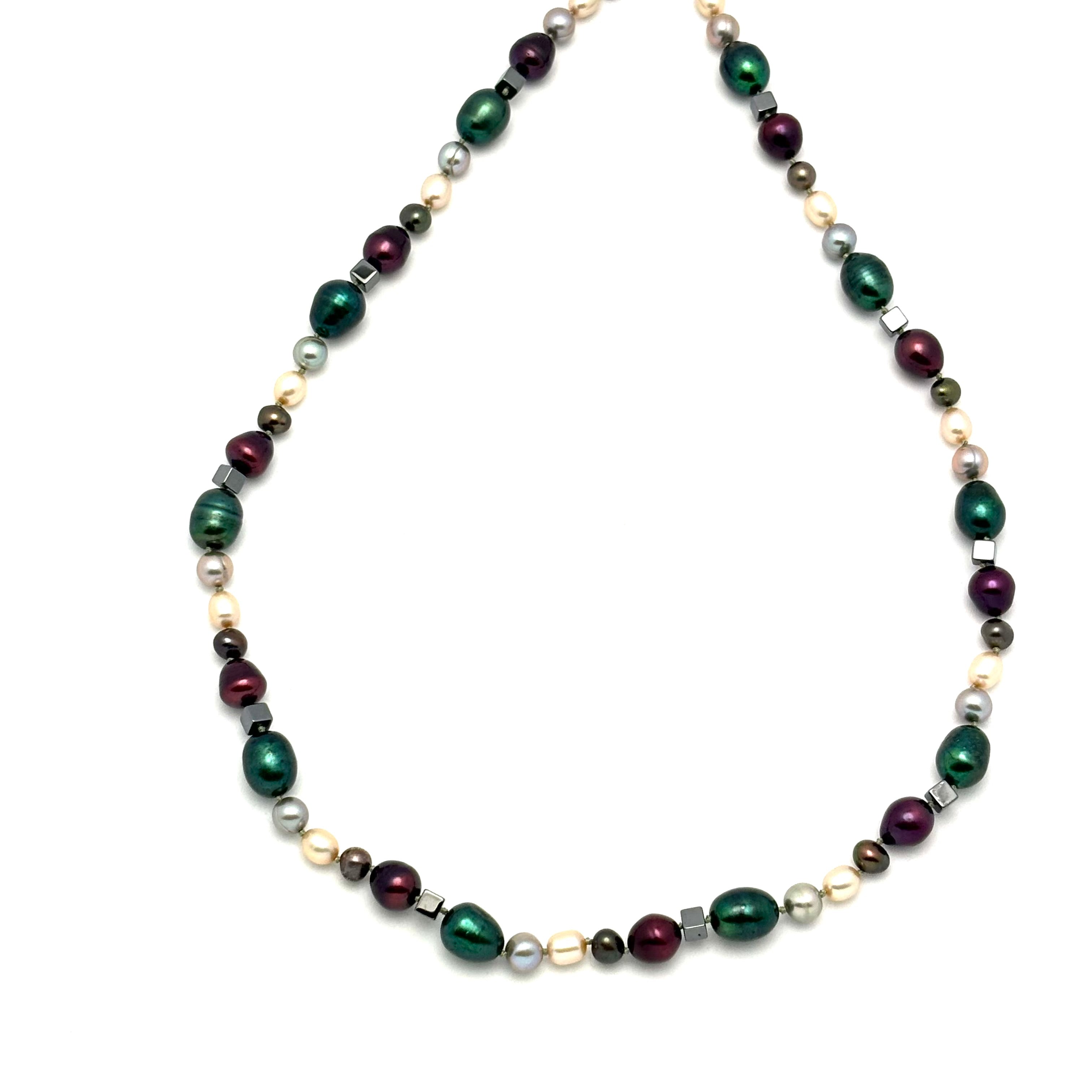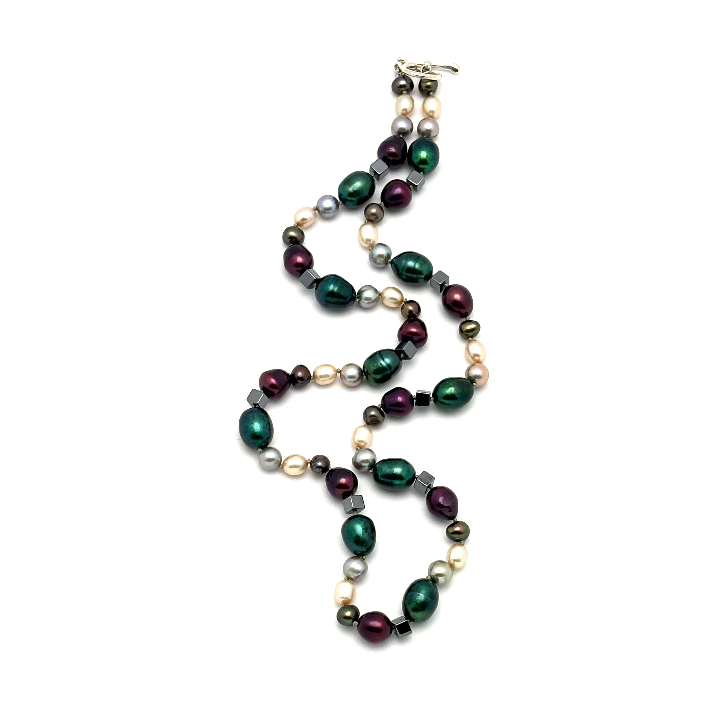 Necklace - Cultured freshwater pearls in an array of colours, shapes and sizes ranging from 4mm - 10.5mm, individually knotted on silk and finished with a sterling silver toggle clasp.