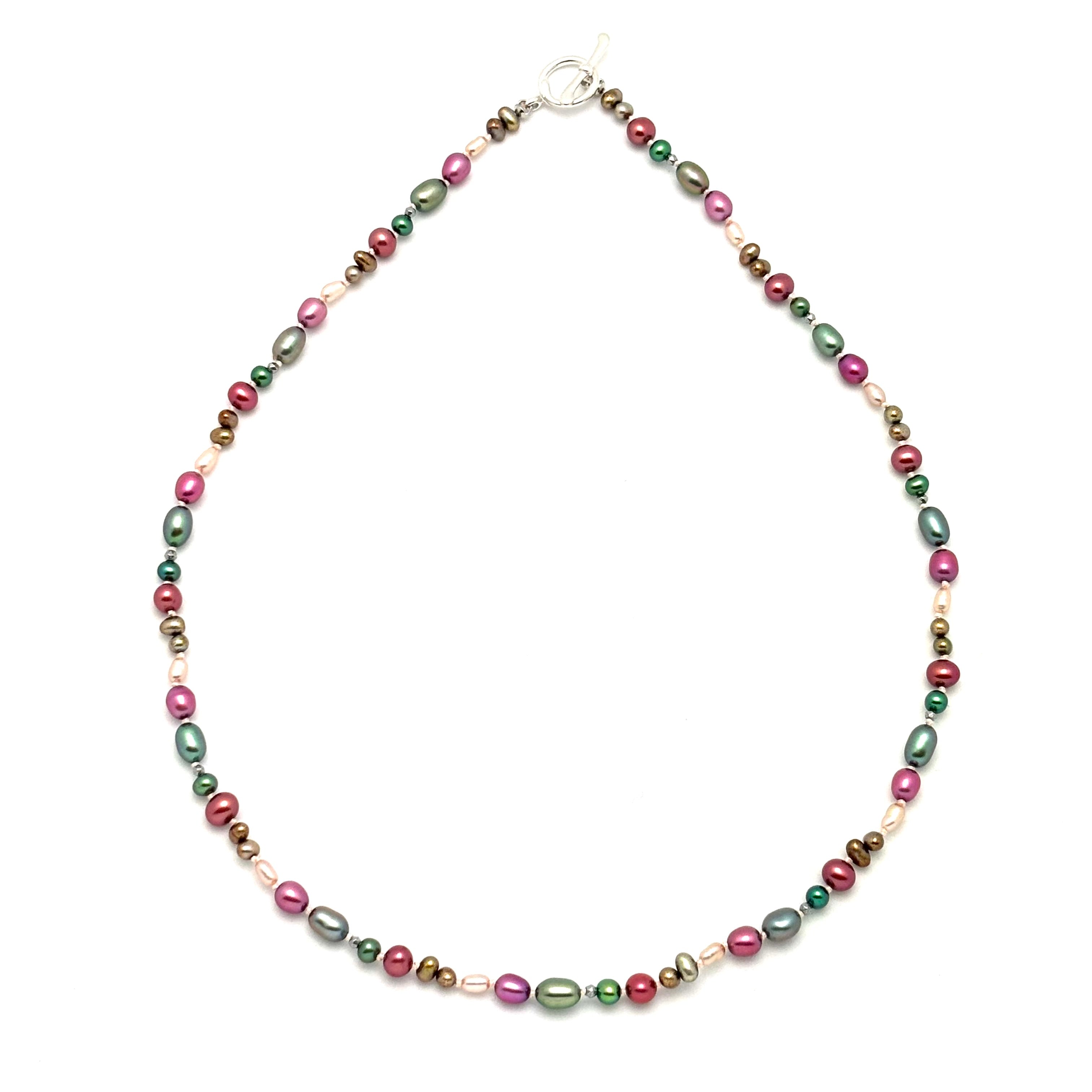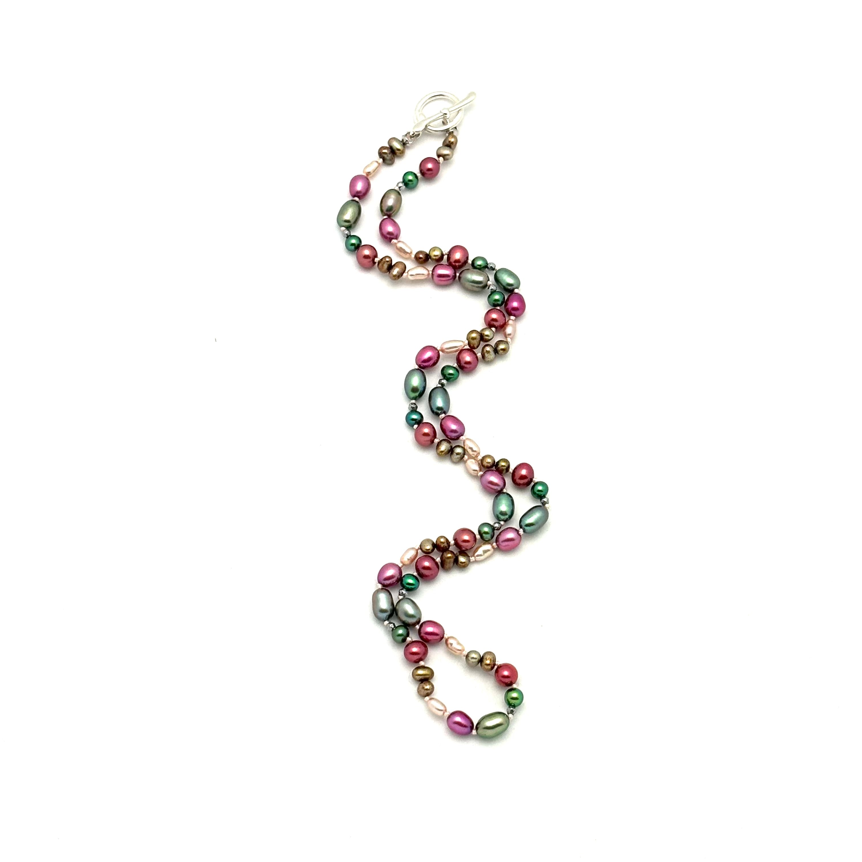 Necklace - Cultured pearls in array of colours, shapes and sizes ranging from 4mm to 7mm, individually knotted on silk and finished with a sterling silver toggle clasp.