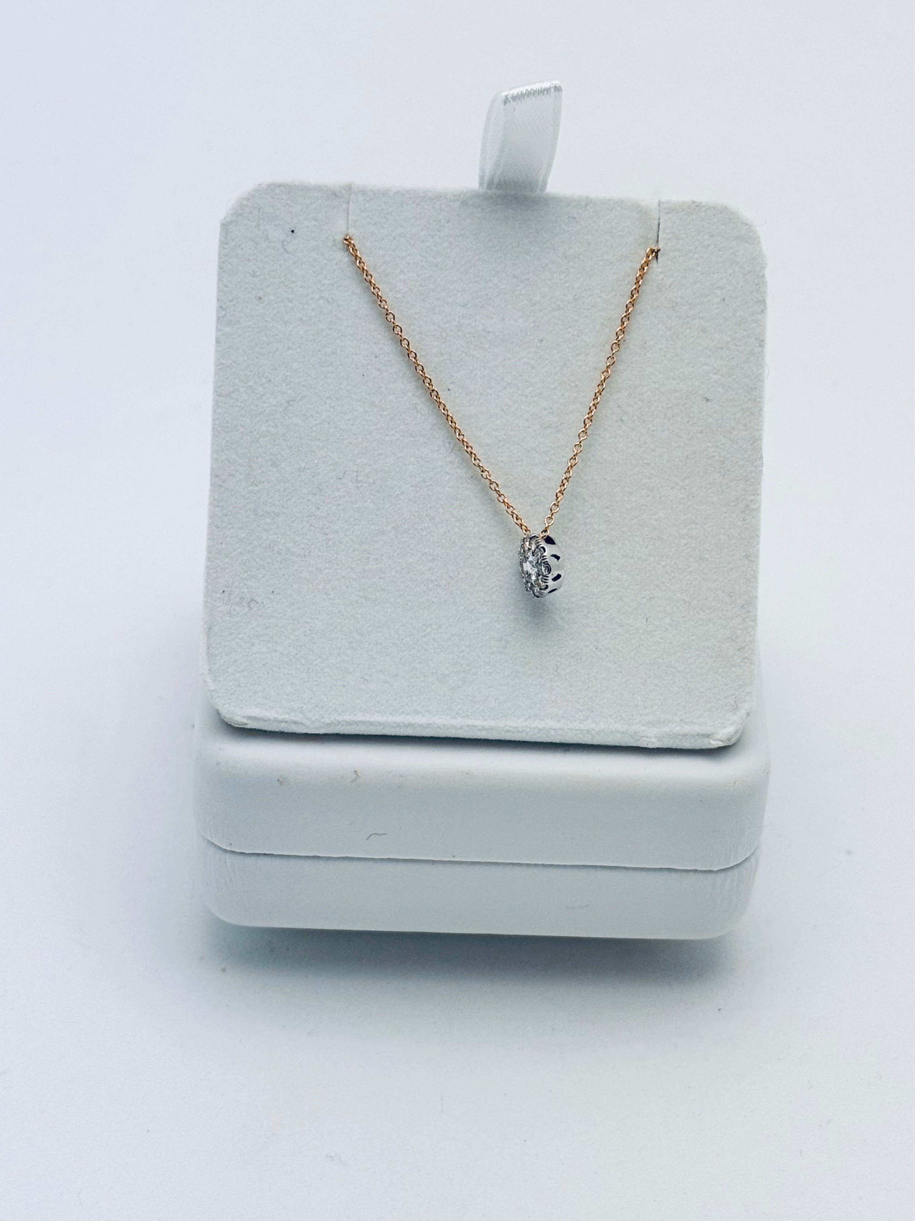 Pendant - 14k yellow and white gold with centre natural Diamond (full brilliant cut, .30 carats, SI clarity, G colour) and 10 accent natural Diamonds (full cut, .008 carats each, SI clarity, G colour. The pendant is priced at $2620.00. We are offering it on a 16 inch 14k yellow gold chain. $340.