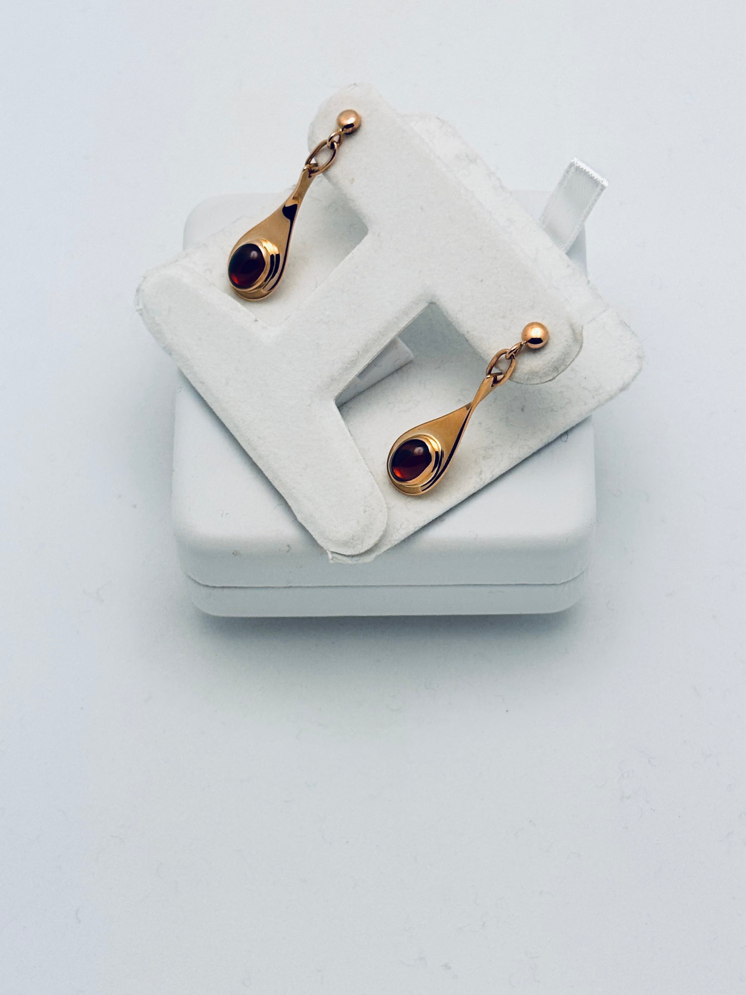 Earrings - 14k yellow gold with 8mm x 6mm cabochon garnets, bezel set on teardrop forged shape, stud drop design for maximum movement, 36mm total in length, fun and classic!