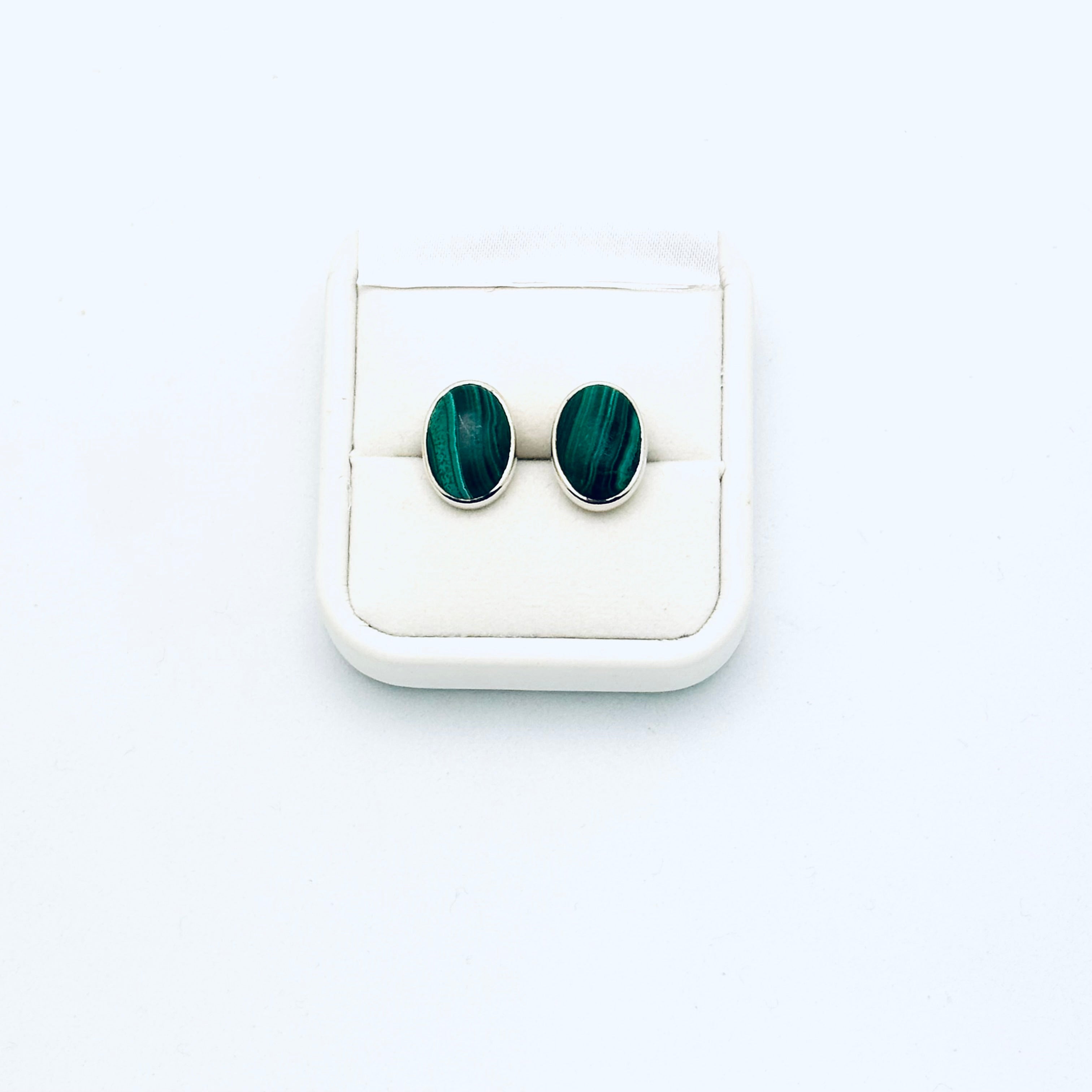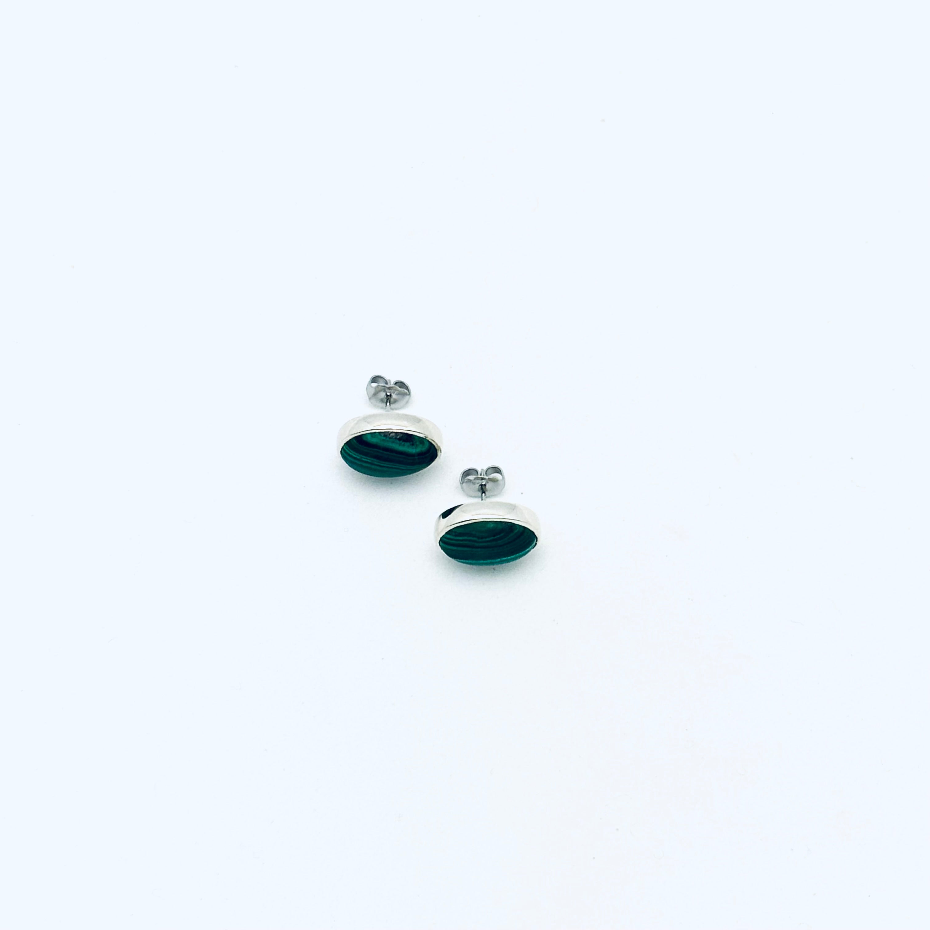 Earrings - sterling silver oval, 14mm x 10mm, bezel set Malachite, classic stud design.