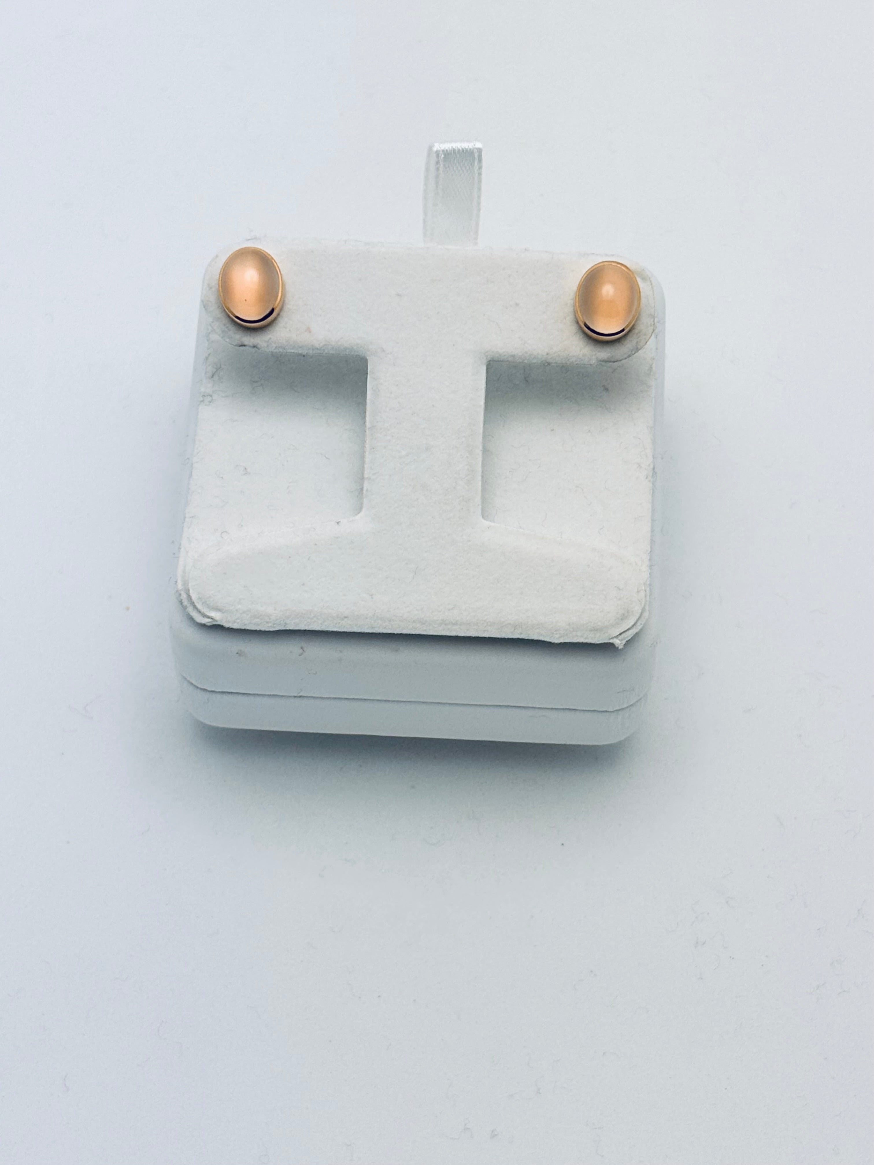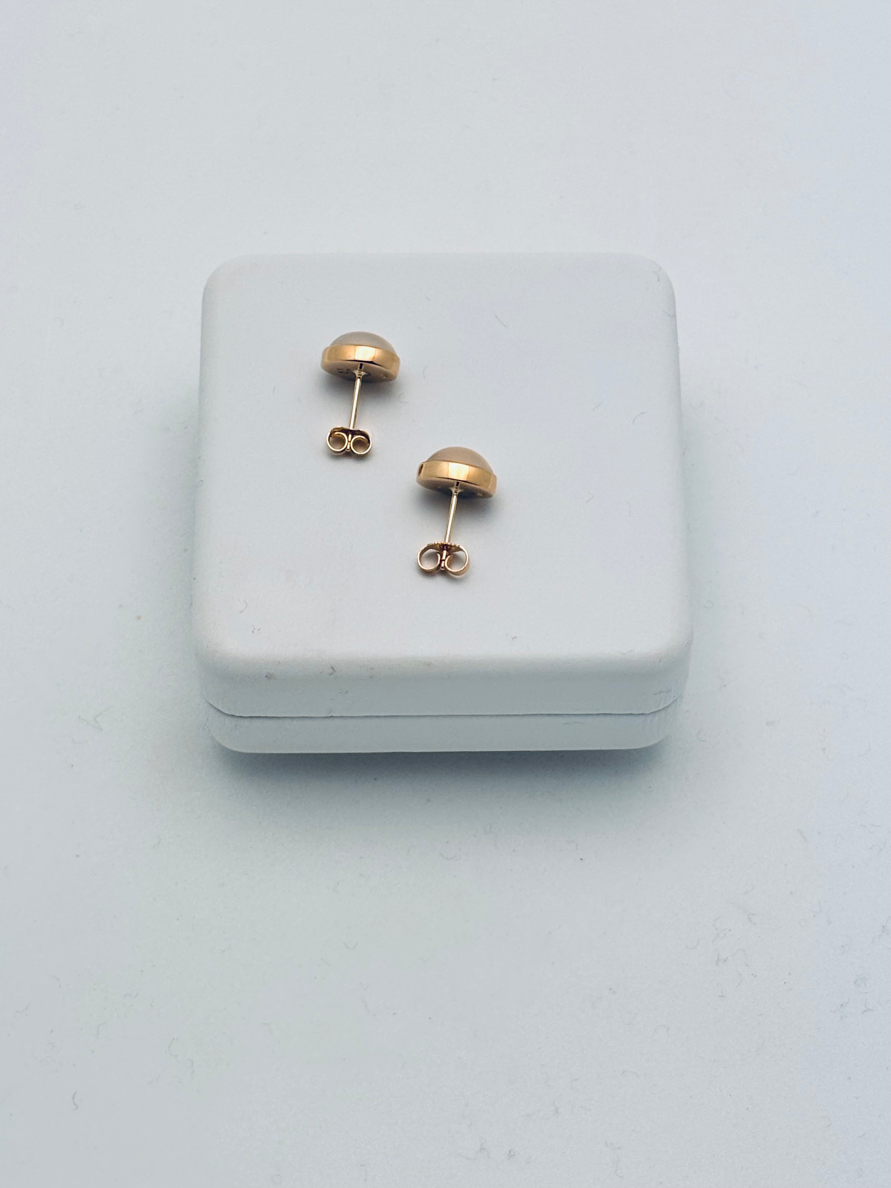 Stud Earrings - 14k yellow gold with 10mm x 8mm oval bezel set Moonstones (India).  The bezels are 3mm high, giving these neutral gems a wonderfully framed appearance.