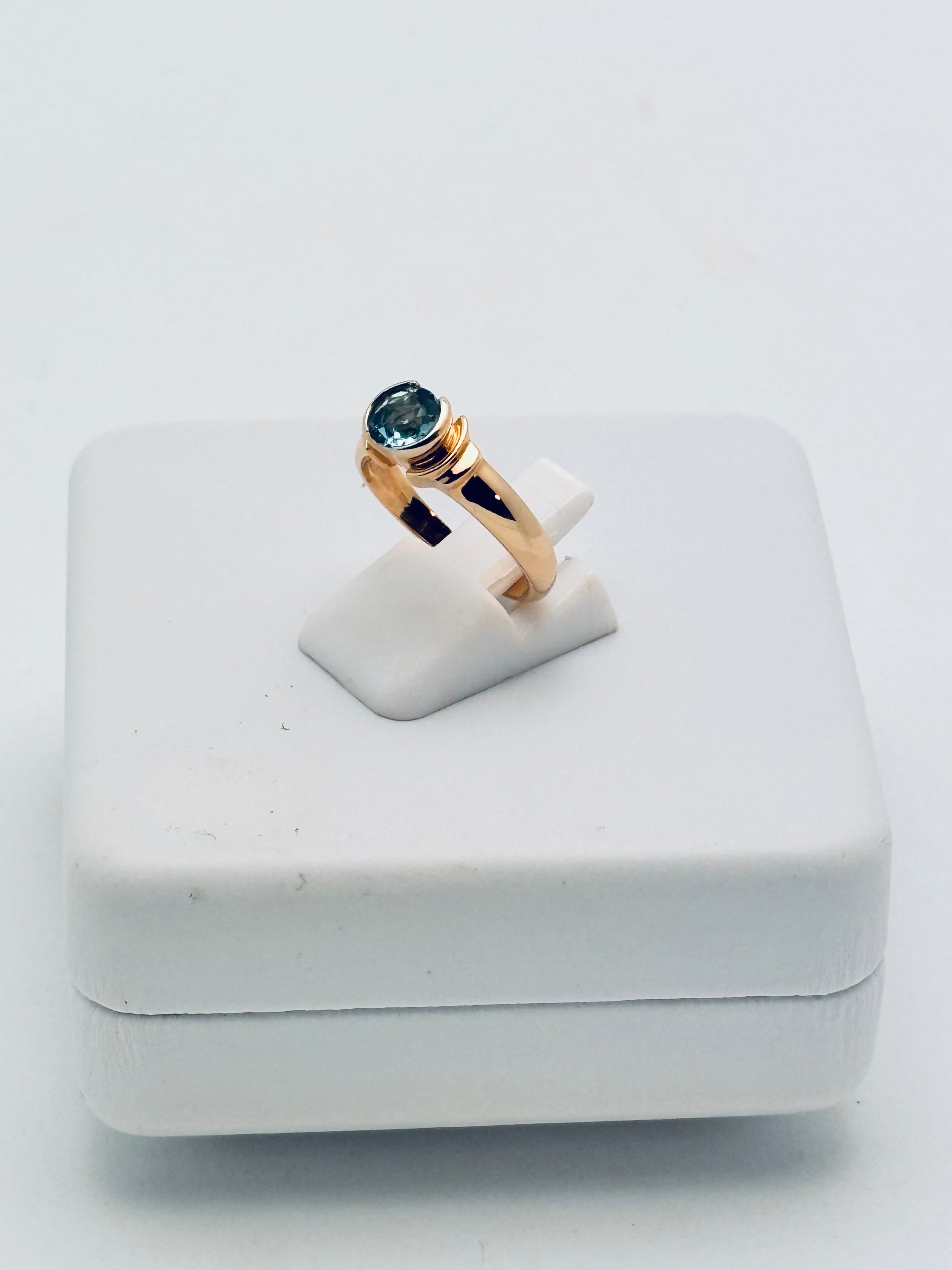 Ring - 14k yellow gold with round faceted 6mm Swiss Blue Topaz, set in 1/2 bezel, havning double grooved shoulders, shank tapering from 2mm to 5mm, size 7.5. A beautiful sculptural contemporary piece.